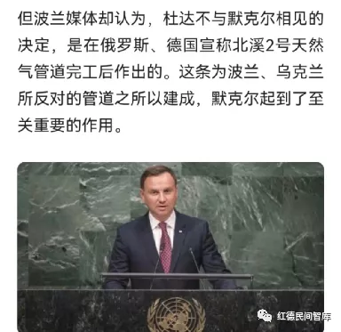 由於擔心德國可能會答應俄羅斯放棄烏克蘭流,使用北溪2號,進而導致波蘭在寒冷的冬天無氣取暖,波蘭總統憤然拒絕了德國總理默克爾的訪問。