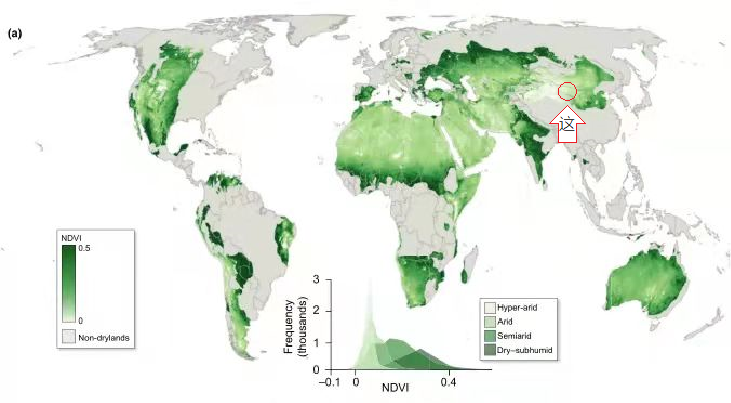 用來比較單位地面上有多少綠色的一種植被指數(NDVI)在世界乾旱、半乾旱區域的分佈。這次調查的地方屬實很白了,幾乎只有南疆、海西和肯尼亞段的東非大裂谷的植被比這更少。圖源:Maestre et al. 2020 | New Phytologist
