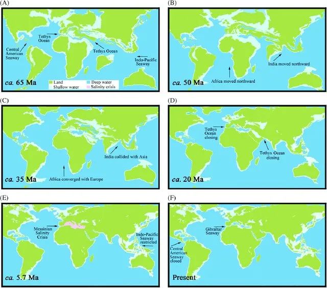 6500萬年前到現在的海陸分佈格局。隨着南北大陸的碰撞,貫穿歐亞的特提斯洋(Tethys Ocean)漸漸縮小為古地中海,最後隨印度與非洲到達今天的位置而徹底被封在歐洲以南。圖源:Hou & Li 2017 | Biological Reviews