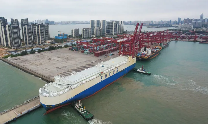 2020年2月16日,滾裝貨船“勞拉”輪駛入海口秀英港(無人機照片)。這是海南自貿區政策實施後的首艘汽車外貿船。新華社記者 楊冠宇 攝