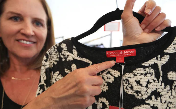 2019年9月12日,在美國科羅拉多州博爾德,克里姆森-克洛弗公司創始人兼首席執行官朗達·斯温森展示中國製造的衣服的標籤。新華社記者 李穎 攝