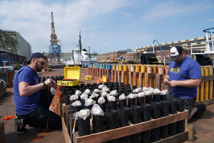 2019年5月25日,工作人員在美國賓夕法尼亞州費城一處碼頭安裝產自中國湖南瀏陽的煙花,為當晚美國陣亡將士紀念日的煙花表演做準備。新華社記者 劉傑 攝