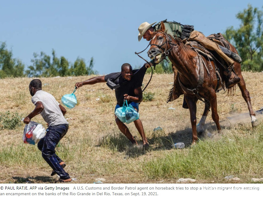圖片顯示美國邊境特工騎馬在德克薩斯州德爾里奧附近的格蘭德河附近追逐海地移民。在一張照片中,一名邊境巡邏人員靠在他的馬鞍上,抓住一個試圖逃跑的人的襯衫。在幾張照片中,移民手裏拿着塑料袋和成捆的財物。