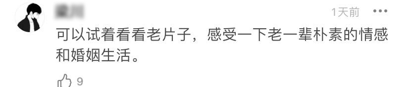 有人建議説,可以試着看看老片子,感受下老一輩樸素的情感和婚姻生活。