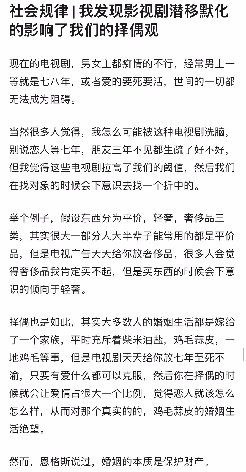 影視劇是否潛移默化的影響了人們的擇偶觀?看到有個網友説,確實受影響了。