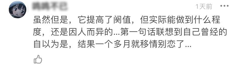 有人説,影視劇確實提高了閾值,但每個人實際能做到什麼程度,因人而異。比如自己曾經一個多月就移情別戀了。