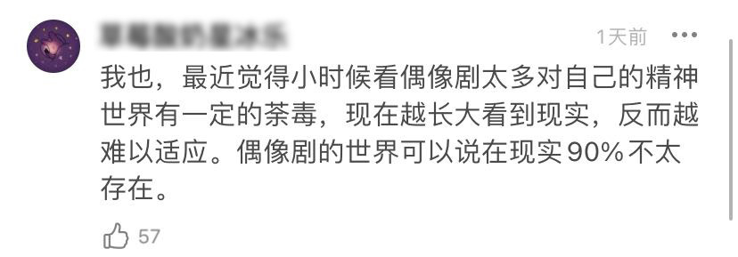 有人提到自己,覺得小時候看太多偶像劇了,對自己的精神世界有一定荼毒,現在越長大看到現實反而越難以適應。