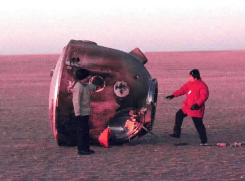 1999年11月21日,我國第一艘試驗飛船神舟一號太空飛行取得圓滿成功,技術人員在對飛船返回艙進行現場處理。圖|新華社