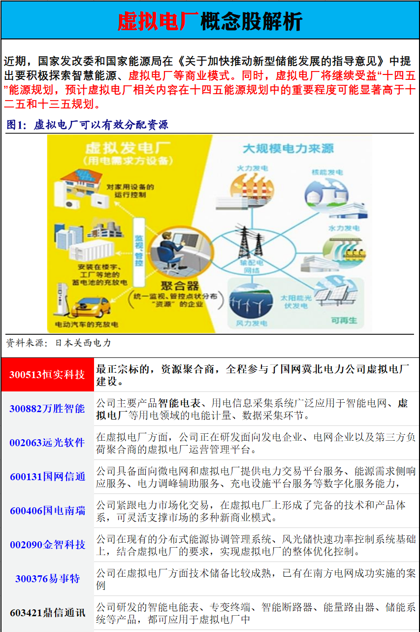 當前,全國多地建立虛擬電廠項目並投入運行。近期,國家發改委和國家能源局在《關於加快推動新型儲能發展的指導意見》中,提出要積極探索智慧能源、虛擬電廠等商業模式。同時,虛擬電廠將繼續受益“十四五”能源規劃,預計虛擬電廠相關內容在十四五能源規劃中的重要程度可能顯著高於十二五和十三五規劃。
