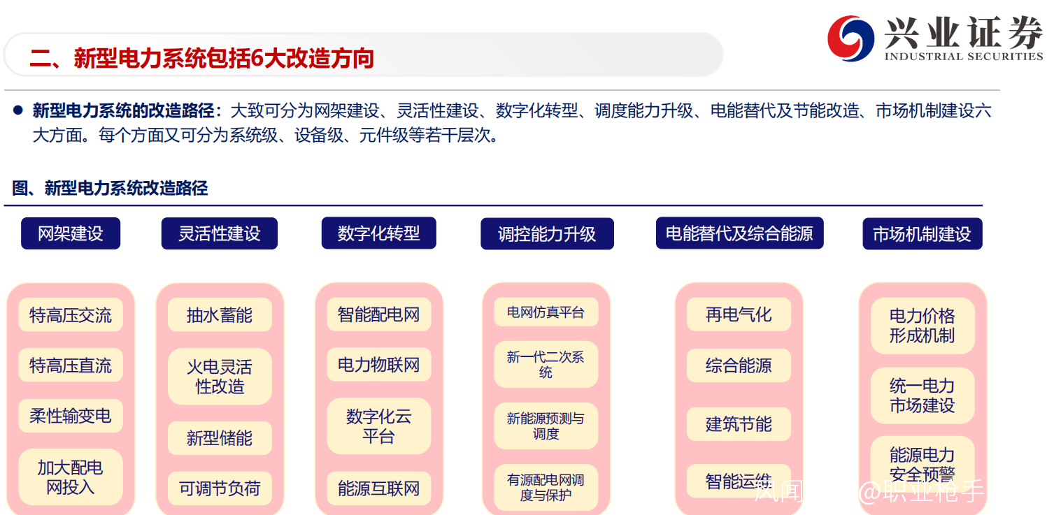 當前,電力行業排放約佔我國 CO2排放總量的四成。未來,“終端用能電氣化+電力系統脱碳”是實現碳中和的主要路徑。因此電力系統轉型升級是關乎我國“雙碳”目標實現的決定性因素。新型電力系統是中央對於電力行業發展作出的系統闡述,明確了電力系統在實現“雙碳”目標中的核心地位,指明瞭電力系統轉型升級的方向。建議關注加強電網建設、提升調節能力、電網智能化、漲電價、電能替代五條主線。