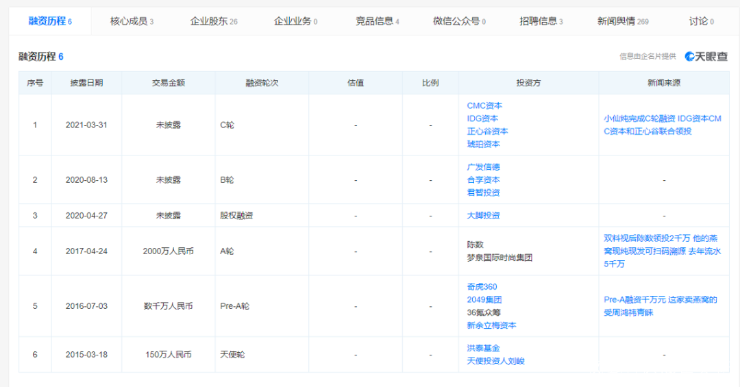 據天眼查APP顯示,小仙燉目前融資已經到C輪,下一步是否要上市小仙燉並未透露消息,但目前從當前小仙燉為發出盈利信息的現狀來看,距離上市IPO或許還有一段距離。