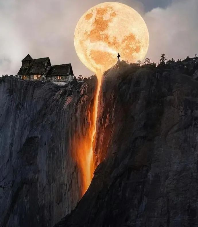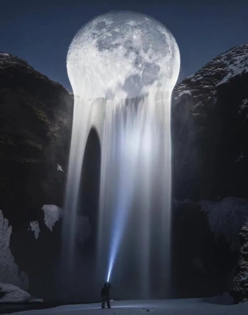 當看到月亮變成了金燦燦的瀑布傾瀉而下,彷彿真的有了一種“疑是銀河落九天”的錯覺。