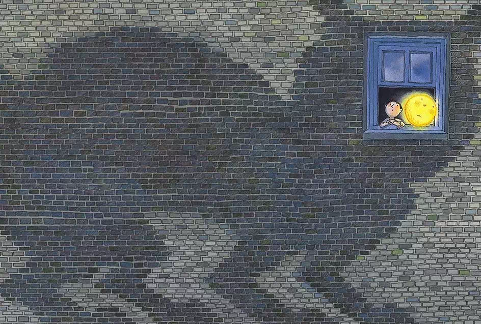 在無數個黃昏後,小男孩把月亮拖到空中,教它旋轉。月亮越變越大,小男孩坐在月亮上越飛越高,然後從高空摔了下來,忘了月亮。