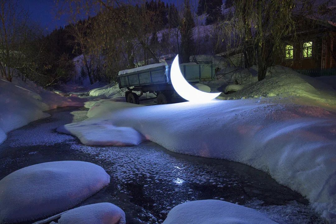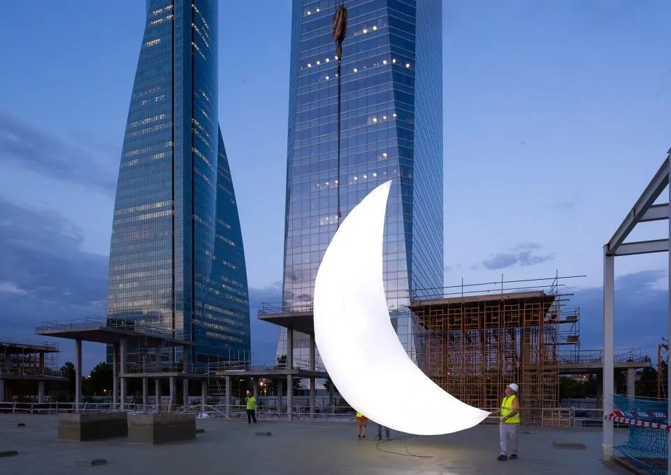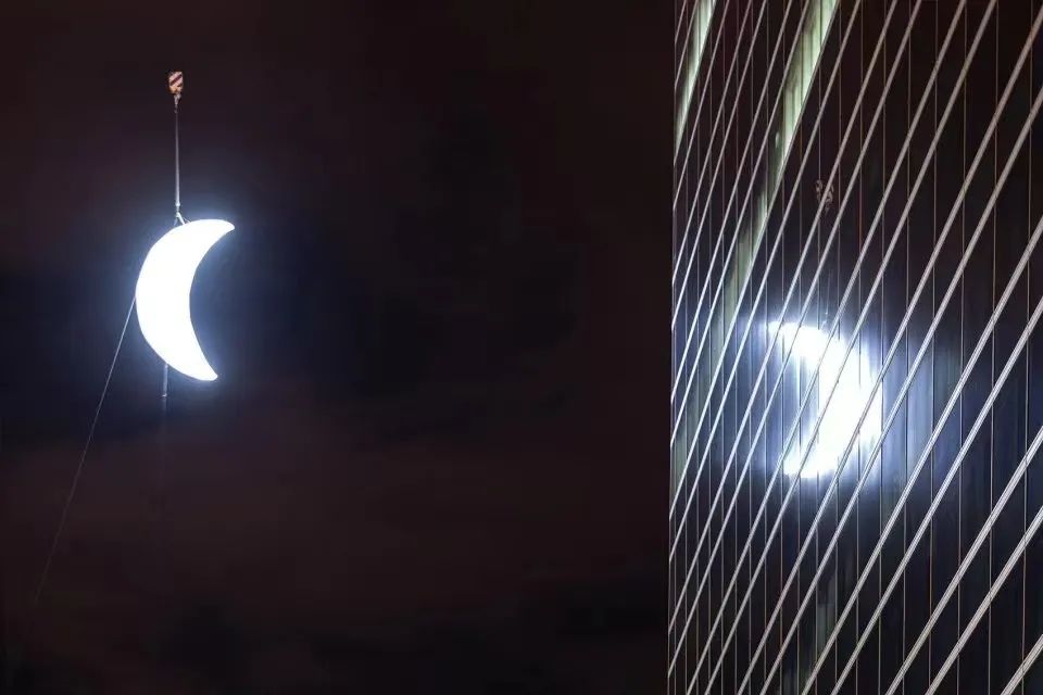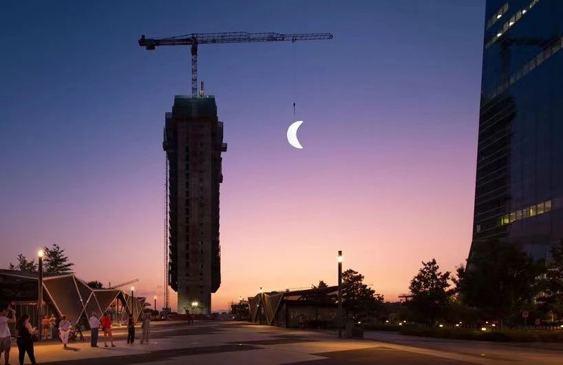 藝術裝置展示在一座未完工的工地上,旁邊的起重機很好的成為了吊起月亮的裝置,塔樓的玻璃牆儘可能的反射月亮的光讓它變得更加明亮。
