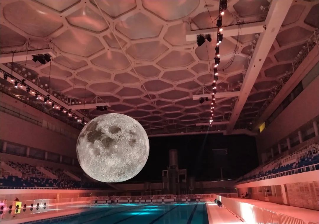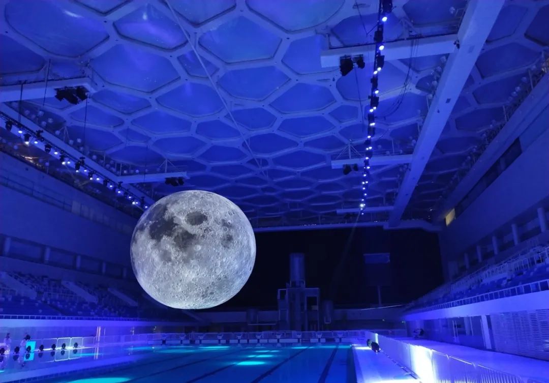2018年7月,luke曾帶着他的月球來到北京水立方進行展覽,月亮懸掛在空曠的場館內,水光月色相交,空間和倒影都及賦中式浪漫。