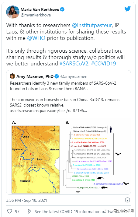 同時她還在推特上發文感謝作者在正式發表前與她分享了這篇研究,並表示只有通過嚴謹的科學合作、成果共享和更深入的研究,而不是政治,才能更好的理解新冠病毒。