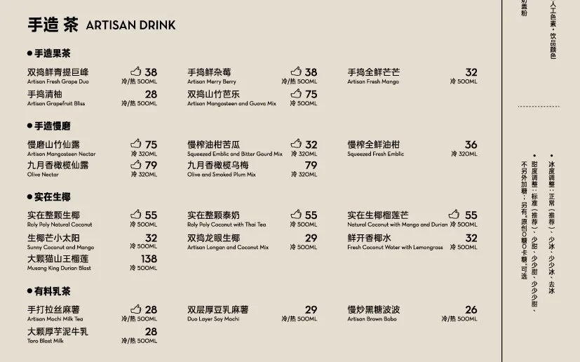 類似的,還有**“慢磨山竹仙露”、“慢榨油柑苦瓜”、“手打拉絲麻薯”**,非常有畫面感,看名字就能想象到製作過程。