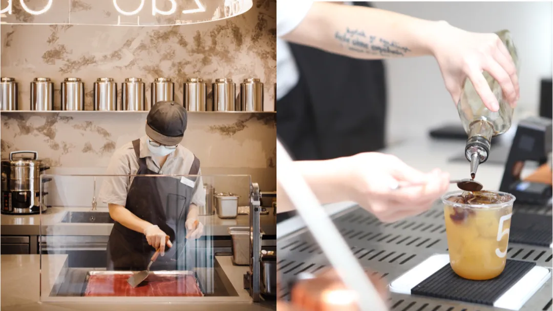 二樓、三樓的後廚,設計為半開放空間,店員用雪克杯調杯、沖泡茶葉,以及黑糖、麻薯、芝士、鮮果等原材料的手工處理、製作過程,顧客也都能看到。