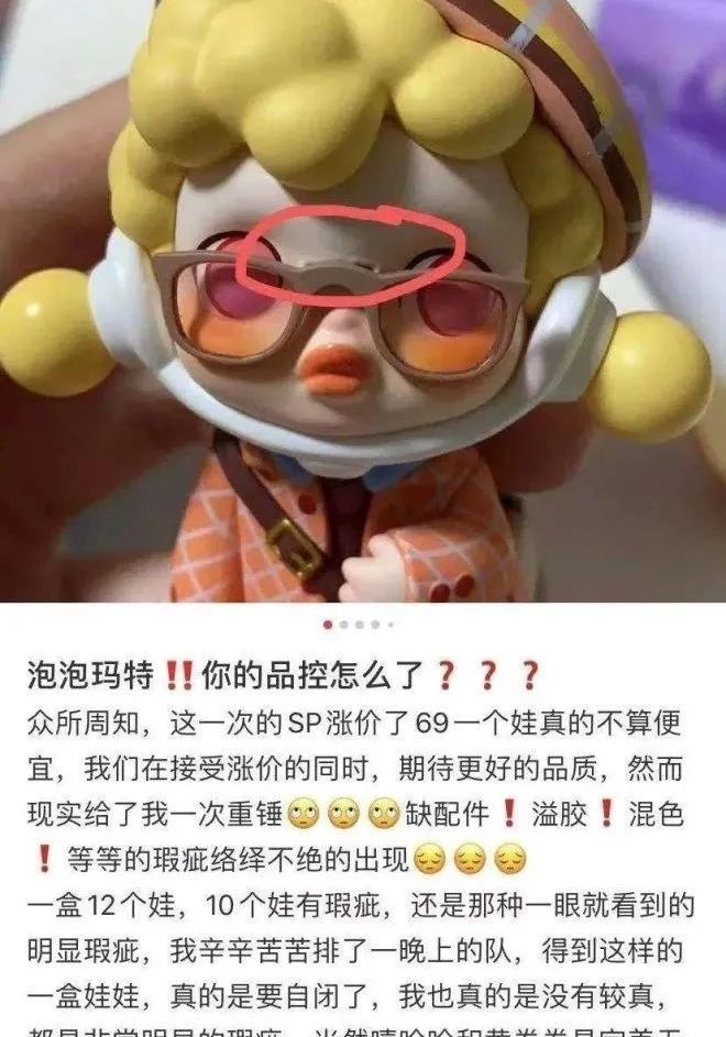 據一位粉絲反映:“一盒12個娃娃,10個有瑕疵,還是一眼就能看到的明顯瑕疵,辛苦排了一晚上隊,我真要自閉了。”