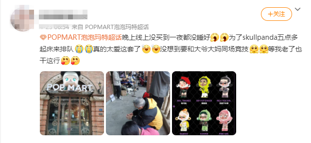 今年4月,泡泡瑪特線下發售skullpanda限量款,無數大爺大媽都提着板凳,天還沒亮就在店外排隊。