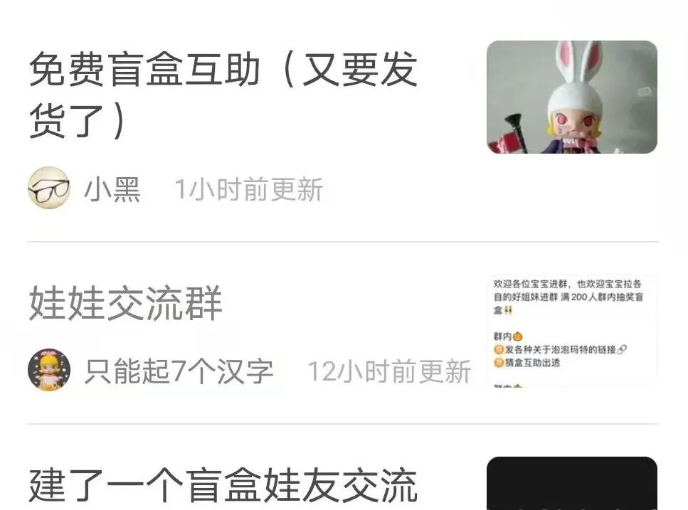 在豆瓣上搜索泡泡瑪特,相關小組中有各種粉絲自發的玩法,比如互相投票獲得稀有款式盲盒;還有專門用來換娃的小組,粉絲抽到的重複盲盒就在這裏進行交換。