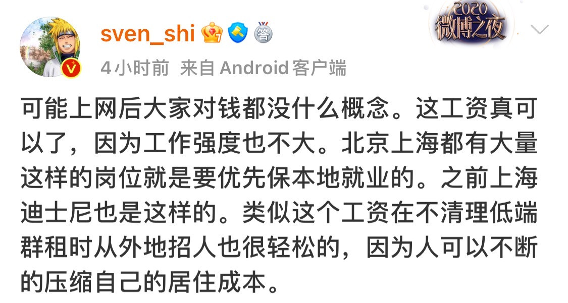 “這工資真可以了,因為工作強度也不大。北京上海都有大量這樣的崗位就是要優先保本地就業的。之前上海迪士尼也是這樣的。類似這個工資在不清理低端羣租時從外地招人也很輕鬆的,因為人可以不斷的壓縮自己的居住成本。”