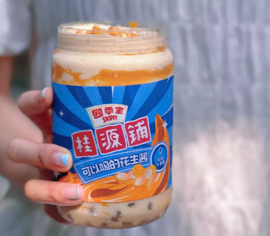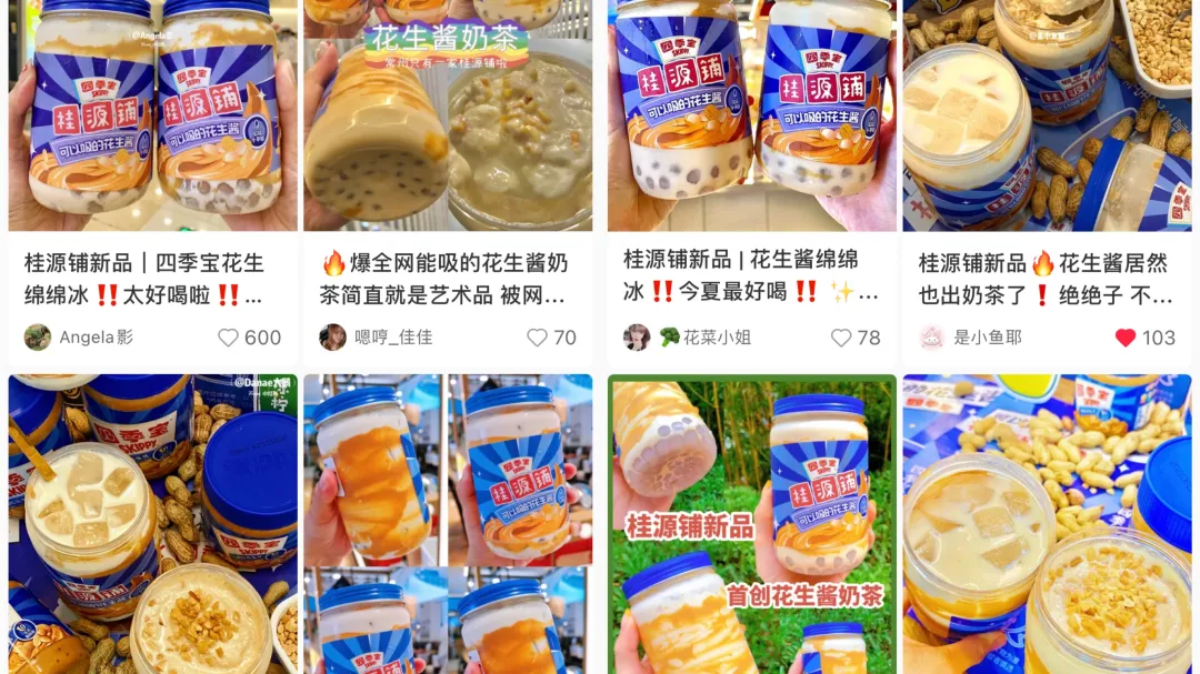 8月24日,桂源鋪和四季寶聯名,在上海200家直營店,上新了“四季寶花生綿綿冰、四季寶花生椰椰水”2款新品,用瓶子裝,看上去就像“一瓶花生醬”。