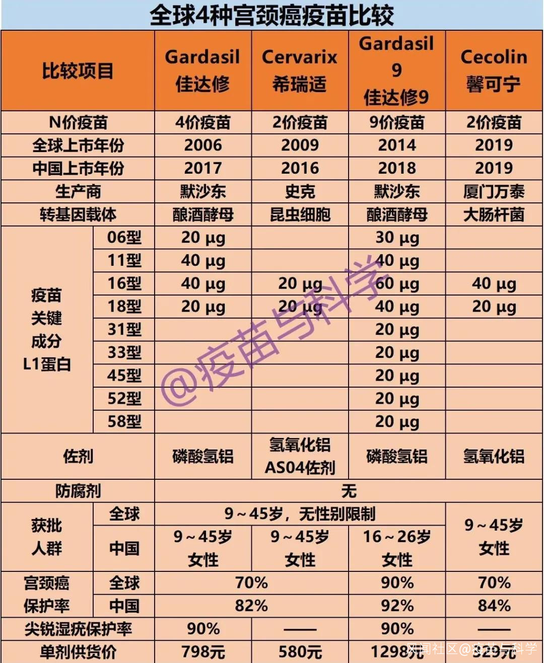 目前,中國有4種宮頸癌疫苗可供選擇,分別是國產廈門萬泰的2價疫苗,進口史克的2價疫苗,進口默沙東的4價和9價疫苗,性能參數、接種年齡範圍、價格等詳見下表: