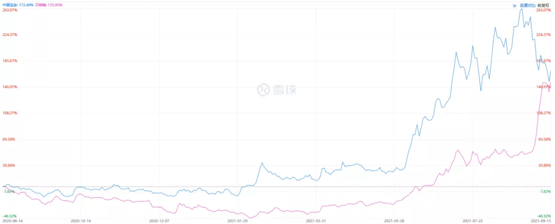 直到北交所消息發佈之後,貝特瑞股價開始和母公司分道揚鑣,貝特瑞一路向北,中國寶安南下急轉,到今天貝特瑞的市值已大幅度超過了母公司。