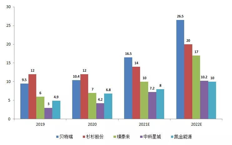同時,貝特瑞雖為行業龍頭,也在未雨綢繆,積極規劃產能,當前貝特瑞的產能並不是行業最大的,不過公司積極在天津、江蘇、四川、山東等地新建和擴建產能,到2022年總規劃產能達到26.5萬噸,已經領先同行一大步。