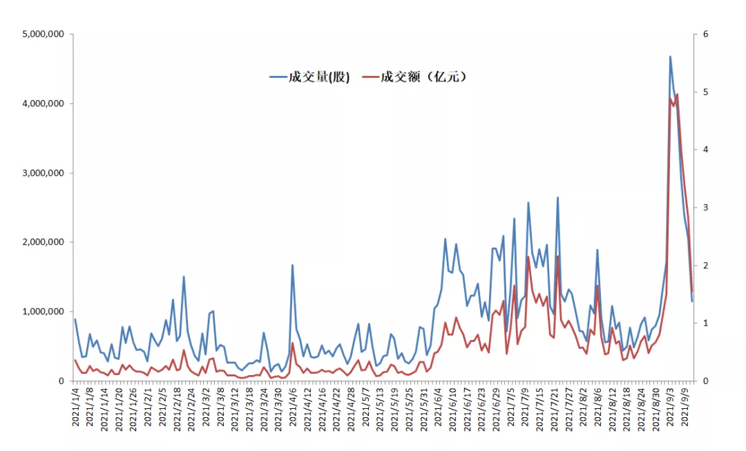 直到北交所成立的消息一出,貝特瑞的成交量和成交額開始飆升,貝特瑞突然在資本市場火起來了。究其原因,新三板雖然是中、小企業的舞台,但畢竟受困於流動性,再好的演員也沒有人捧場。