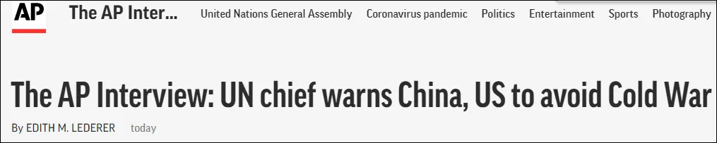 ▲據美聯社9月20日報道,聯合國秘書長古特雷斯18日接受其專訪時表示,中美兩個敵對的地緣政治和軍事戰略將構成危險、分裂世界,必須儘快修復這一“搖搖欲墜”的關係。