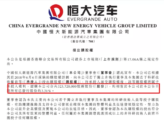 今日早間,恒大汽車發佈公告稱,**已向技術人員授出3.24億股購股權,佔公司股本的3.31%,授予對象包括本公司3名董事及集團約3180名僱員。**恒大汽車內部人士表示,該公司處於多事之秋,此舉有利穩定公司核心技術團隊。