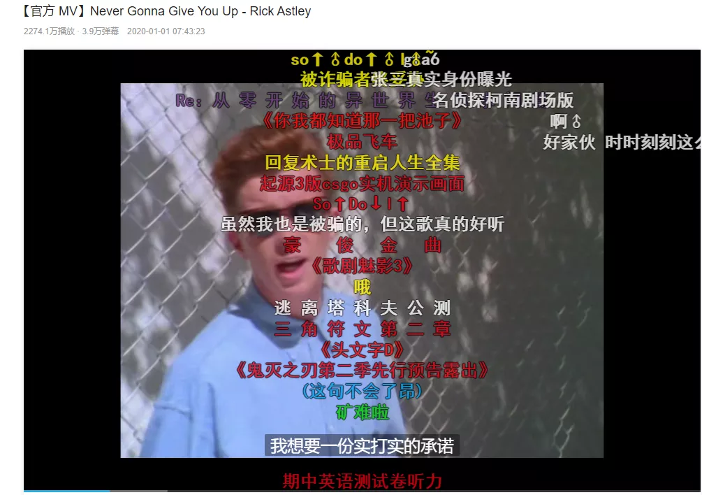 和它在YouTube上驚人的點擊量一樣,索尼音樂去年在B站上傳了這首歌的官方高清版本,只過了短短一年,它在B站的播放量就已經突破了兩千多萬,而且就算官方這回使用了最準確的標題,在彈幕和評論區裏依舊有不少“願者上鈎”,自願被騙進來的觀眾。