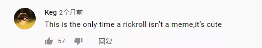 這次沒有熟悉的“標題惡作劇”,點進去後你就會看到大牙狸對着鏡頭深情演唱改編版的《Never Gonna Give You Up》,評論區裏也其樂融融,從“又被騙了”轉變成了“這是最可愛的RickRoll”。