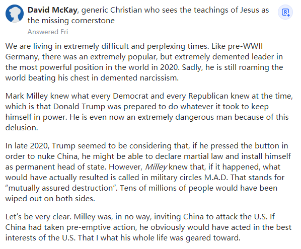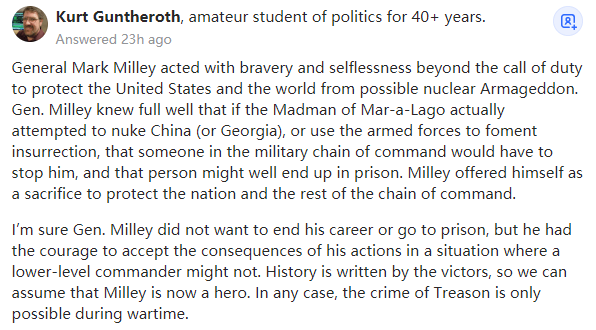 馬克·米利**(Mark Milley)將軍勇敢無私地履行了職責,保護了美國和世界免遭可能發生的核末日的威脅。米利(Milley)將軍深知,如果海湖莊園(Mar-a-Lago)的那個瘋子真的試圖用核武器襲擊中國(或格魯吉亞Georgia),或利用武裝力量煽動暴動,軍事指揮系統中的某個人將不得不阻止他,即便此人可能最終會被關進監獄。米利(Milley)**犧牲了自己以保護國家和其他指揮系統。