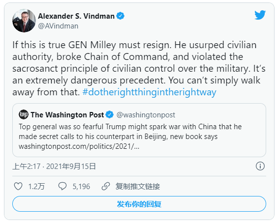 他沒有犯叛國罪。到目前為止,伍德沃德似乎只是在試圖提高新書的銷量,而米利****(Milley)的言行卻被斷章取義,這與左派和媒體試圖利用特朗普的每一句話是一樣的。你可以有很多理由不喜歡米利****(Milley),並認為他應該辭職或被解僱,但在這裏,他提出的解釋似乎是非常合適的,我確實不認為這些電話有什麼錯。