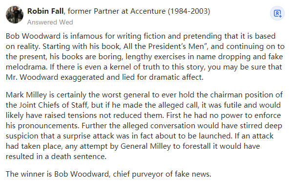 鮑勃·伍德沃德(Bob Woodward)因寫小説並假裝它是基於事實的而臭名昭著。從他的書《總統班底》(All the President’s Men)開始,一直到現在,他的書都是枯燥無味的冗長的堆砌,充斥着名不副實的假情節。如果這個故事有一個核心的真相,那你可以肯定伍德沃德先生是在為了新書的戲劇性影響而誇大和撒謊。