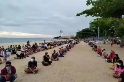今年7月4日,在關於討論泰國民生多艱的社交媒體帖子裏,這樣一張照片成為了熱門:幾千名失去工作的泰國民眾,分成數行整齊地盤腿坐在芭提雅的海灘上,等待着過路的好心人施捨。要知道,芭提雅作為全球聞名的海景度假網紅地,一度還入圍過全球城市500強榜單。