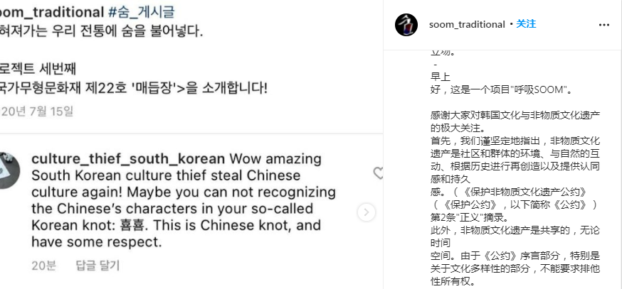 但宣傳材料並沒有提到中國文化的影響,中國網友質疑他們竊取中國文化的評論還被掛了出來,並搬出聯合國教科文組織的《保護非物質文化遺產公約》,表示:“我們有理由認為,東亞歷史上也存在着文化共享的現象,因此宣傳非遺和文化本身的所有權對於國際社會來講不是一個恰當的態度。”