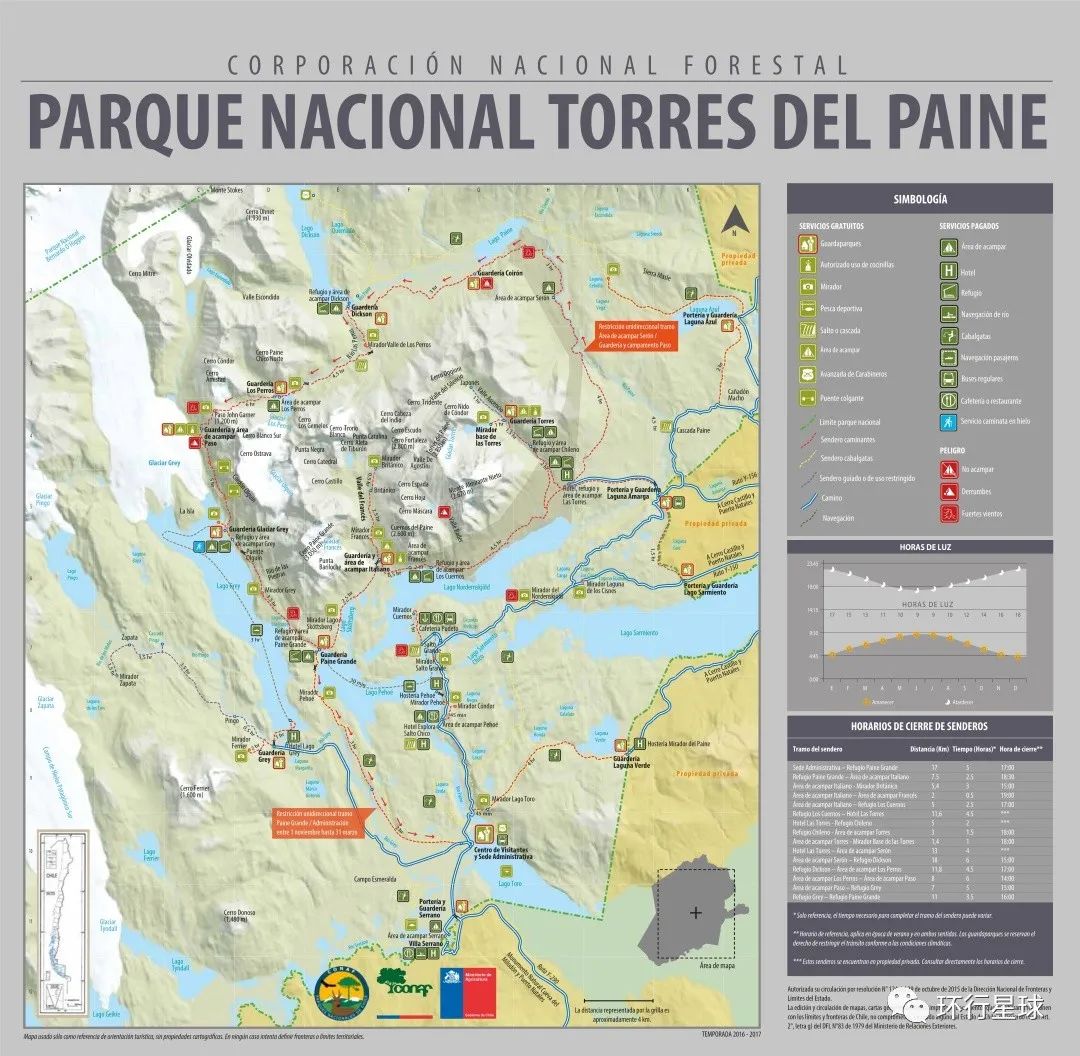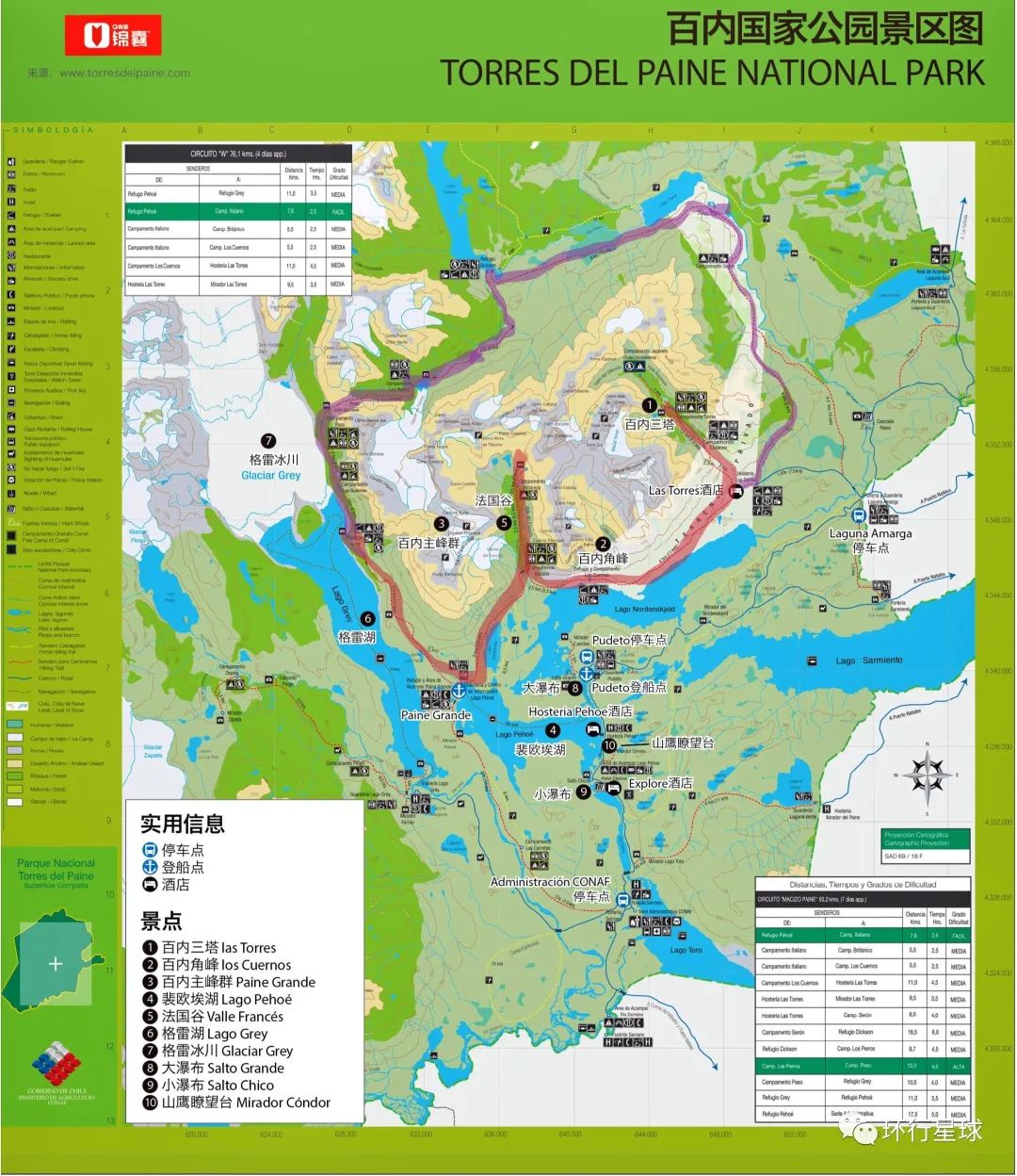 **官方地形路線圖,精微恰切。門票20000比索(約合165元)一張,可以三次進園。**圖:torresdelpaine.com