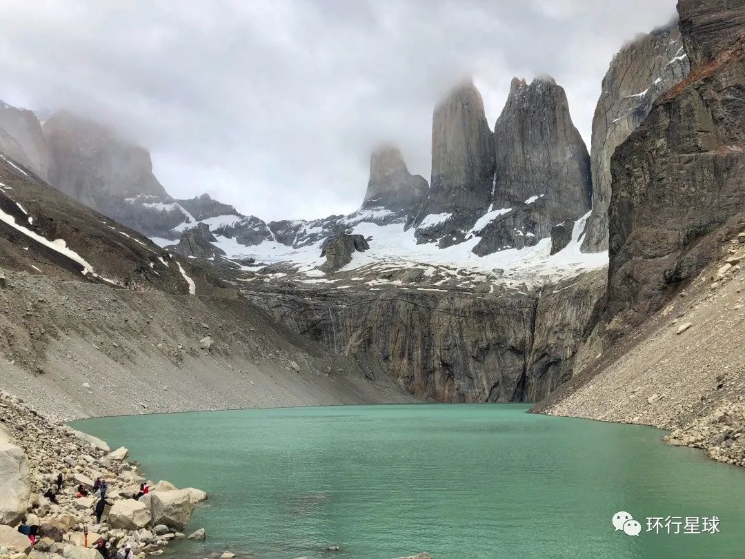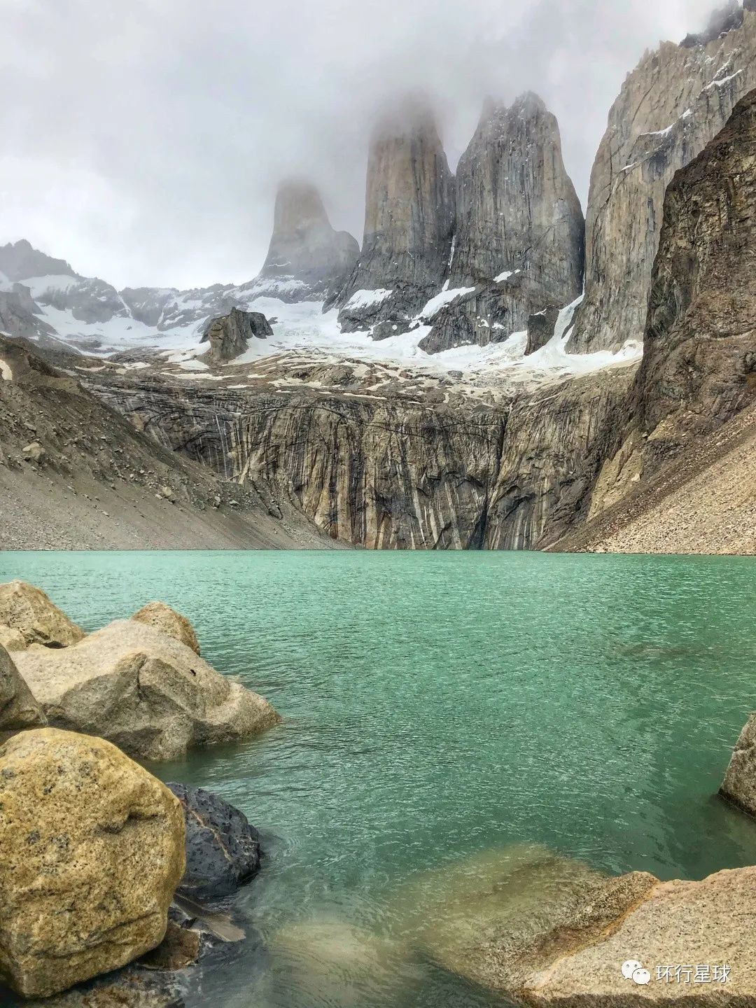 **最負盛名的百內三塔忽隱忽現於氤氲水汽間,**亦有不同於金光初照下的空靈清幽之美。