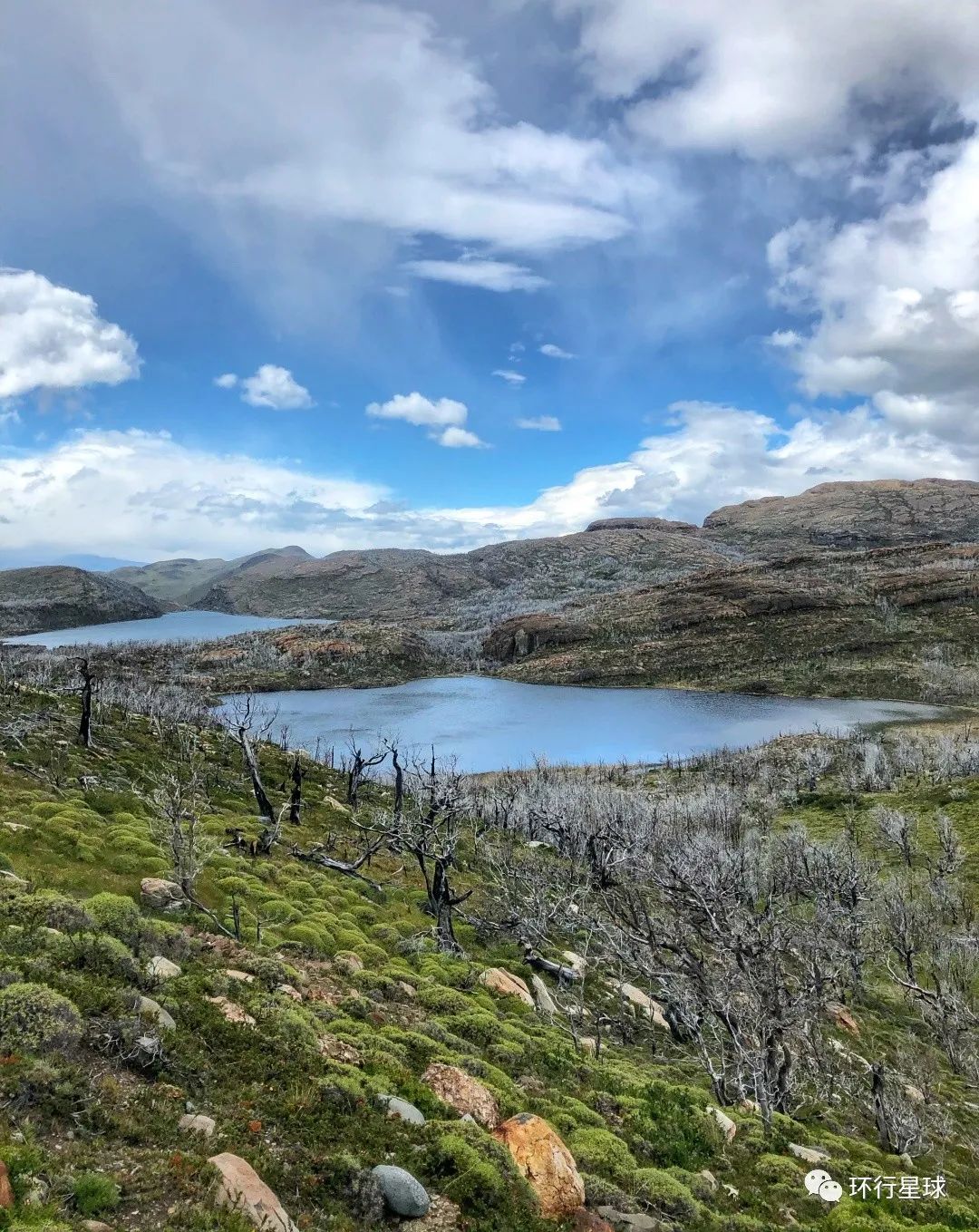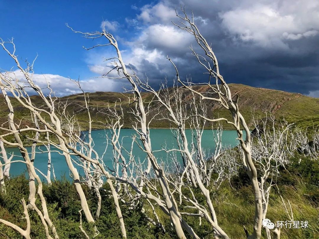山鷹瞭望台背面的“墳場”。漫山遍野的枯枝亡幹,像被冰晶附着,透露着一股深深的寂靜與肅殺之感,為百內風光增添了一份關於生命的厚重。