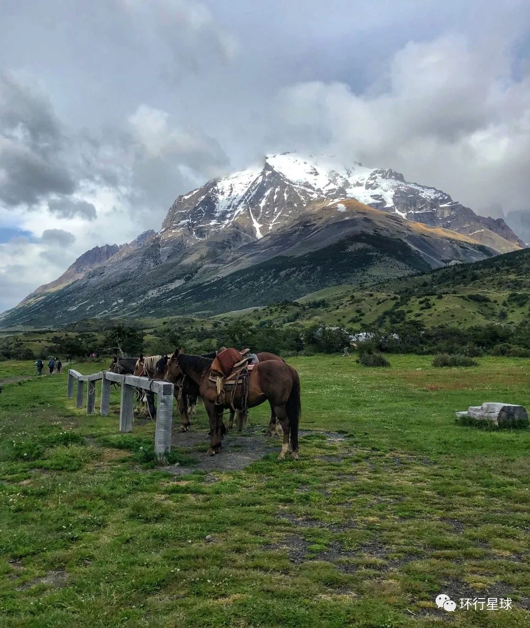 第一天的起點area de acampar Las Torres,遠山近馬相映成趣。
