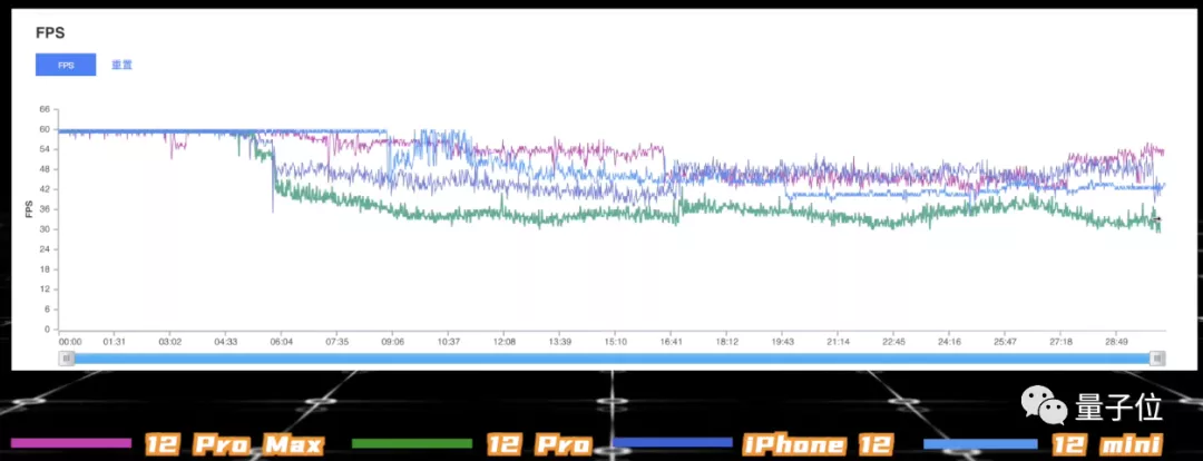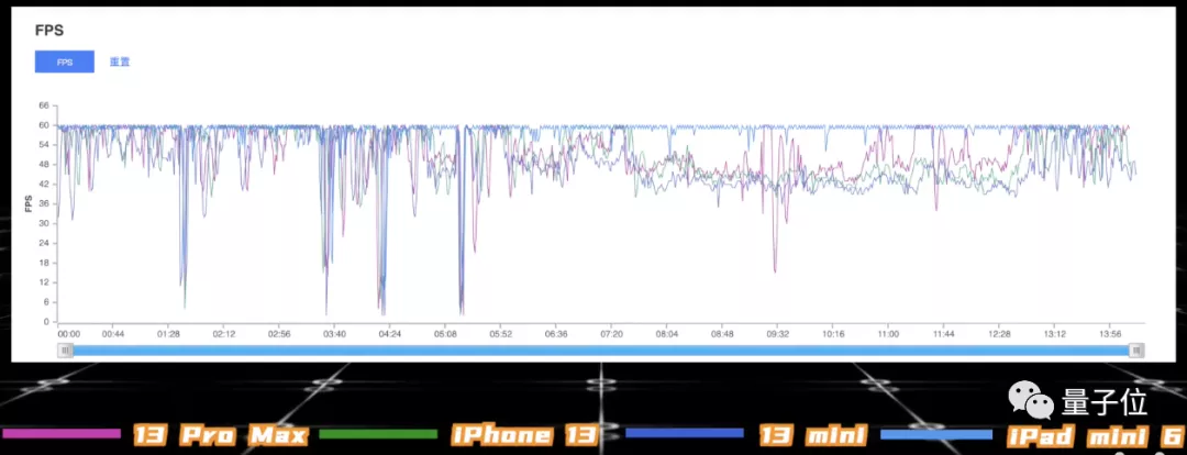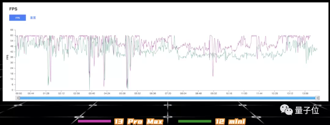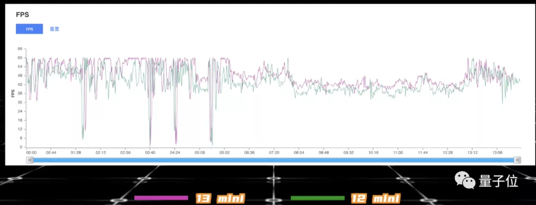 其中,13 Pro Max在降頻到50幀率左右後後期還能恢復;13在幀率穩定40和穩定50之間反覆橫跳;13 Mini則在降到40幀之後不再波動直接開擺。