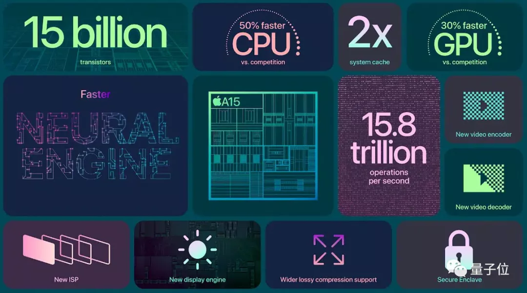 然後是晶體管數量,A15集成了150億個晶體管,比上代A14是118億。