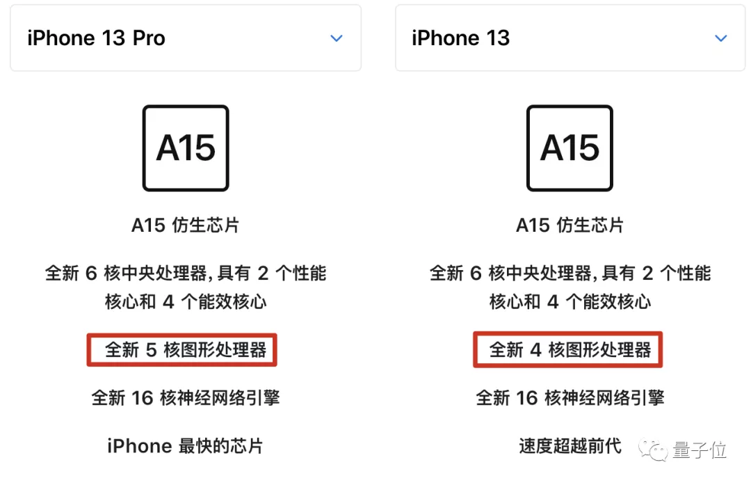 iPhone四個產品線,Pro和Pro Max上的A15有5個GPU核心,普通13和Mini上只有四個。
