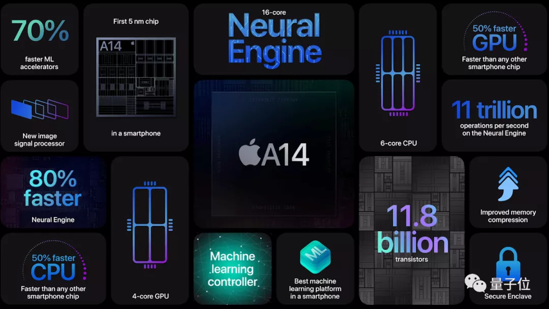 A14時神經引擎從8核升到16核放在海報上方正中間醒目位置,速度還快了80%。