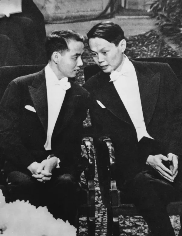● 1957年12月,李政道(左)、楊振寧(中)在瑞典接受諾貝爾物理學獎