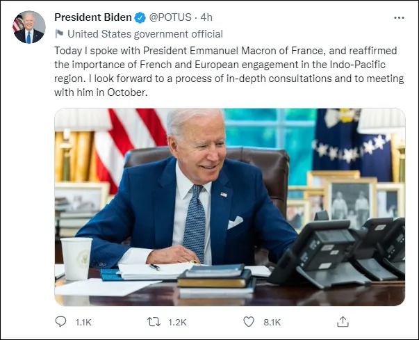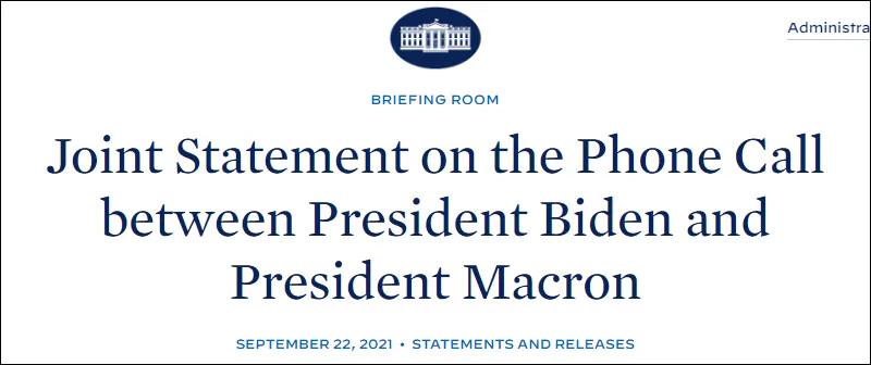 馬克龍與拜登通話後,據美國媒體報道稱,雙方發表了內容一致的聲明。聲明稱,盟邦如提早公開磋商,應能避免核潛艇危機。